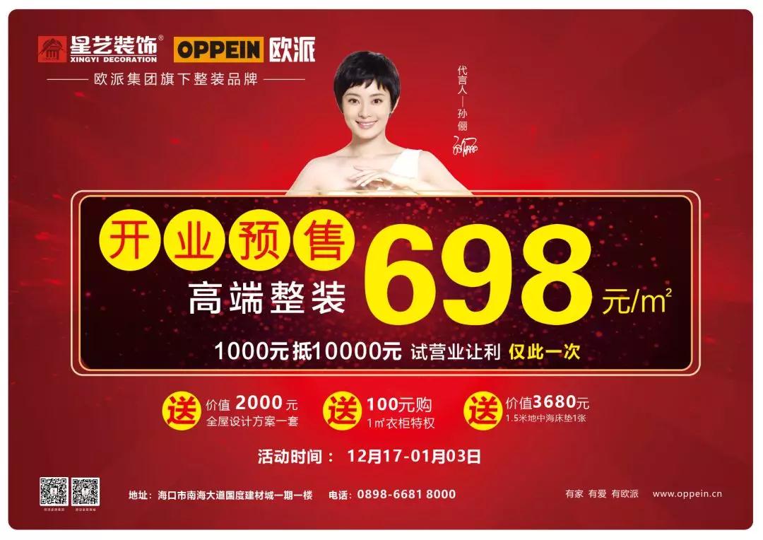 海南星藝裝飾2003年扎根海南,經過15年的發展與壯大,現已遍布海南各地,星藝人秉承以“裝飾”會友,做“誠信”裝修的經營理念,得到了社會各界及廣大消費者的信賴與認可。星藝裝飾為了回饋廣大業主對我們的支持與信任,為滿足廣大業主能獲得更省心、省力、省時、省慮、省錢的裝修需求。星藝裝飾特別攜手廣州歐派家居集團強強聯手在海口成立星藝歐派星居整裝!共同以實現為更多業主朋友打造高品質的精品空間、文化空間為目標,給海南廣大市民帶來更多先進的居住理念和空間文化。